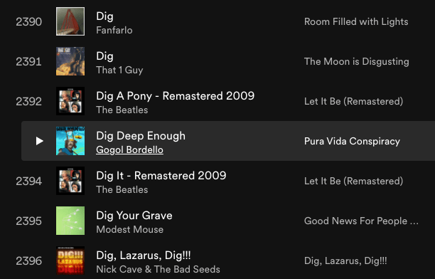 But the inadvertent absences and longer stretches of time between being able to take ample alphabetical bites out of my iPod just made coming back to it more fun and more of a thing I wanted to do so much that I actually made the time for it, which is exactly why all the restocked me-time of working from home this month immediately went into 12,7000 Songs. And there was a lot of fun to be had in the D’s! Holy shit, there were some delightful quirks of alphabetical order and couldn’t-have-planned-it-if-I-tried timing at play here.