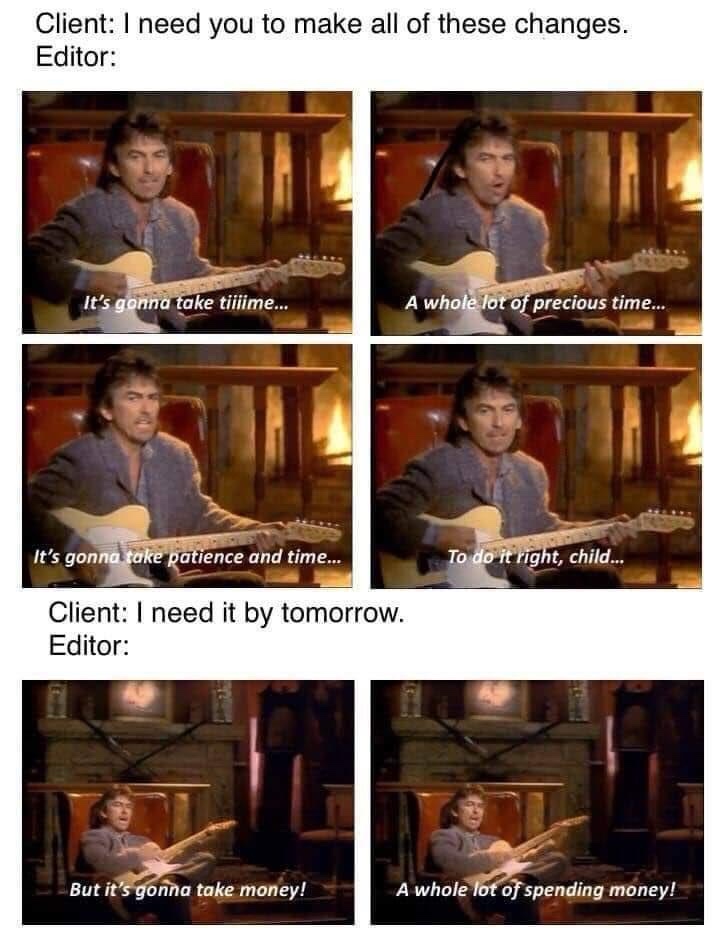 Same friend also sent me snippets from the song’s weirder of its music videos, reframed to neatly summarize why I don’t find freelancing to be a juice that’s worth the squeeze anymore: