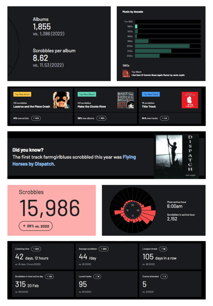 It also does merit mentioning how 2023 was the year that Last.fm, a site that I’m low-key convinced gets the majority of its traffic and tabulations from people whose last act on the site was syncing their Spotify accounts to it a decade ago, stepped up its Last.Year game and not only offered up a ton of stats but also threw, like, at least three quarters of its annual budget at creating a legitimately impressive Wrapped-adjacent recap visualization and experience. Every year that site is still running impresses me, so it was an especially nice surprise to see the more comprehensive of the year-end stats going absolutely balls to the wall with ’em.